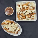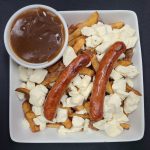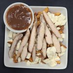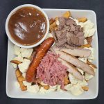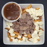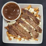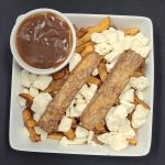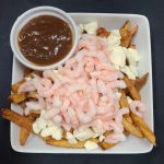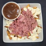 Frites maison, sauce boeuf et vin blanc, fromage en grain