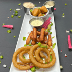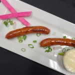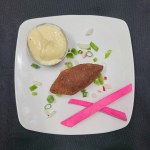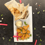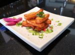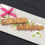 Boulette végé servie avec sauce sésame et brunoise de radis, poivrons verts et oignons verts